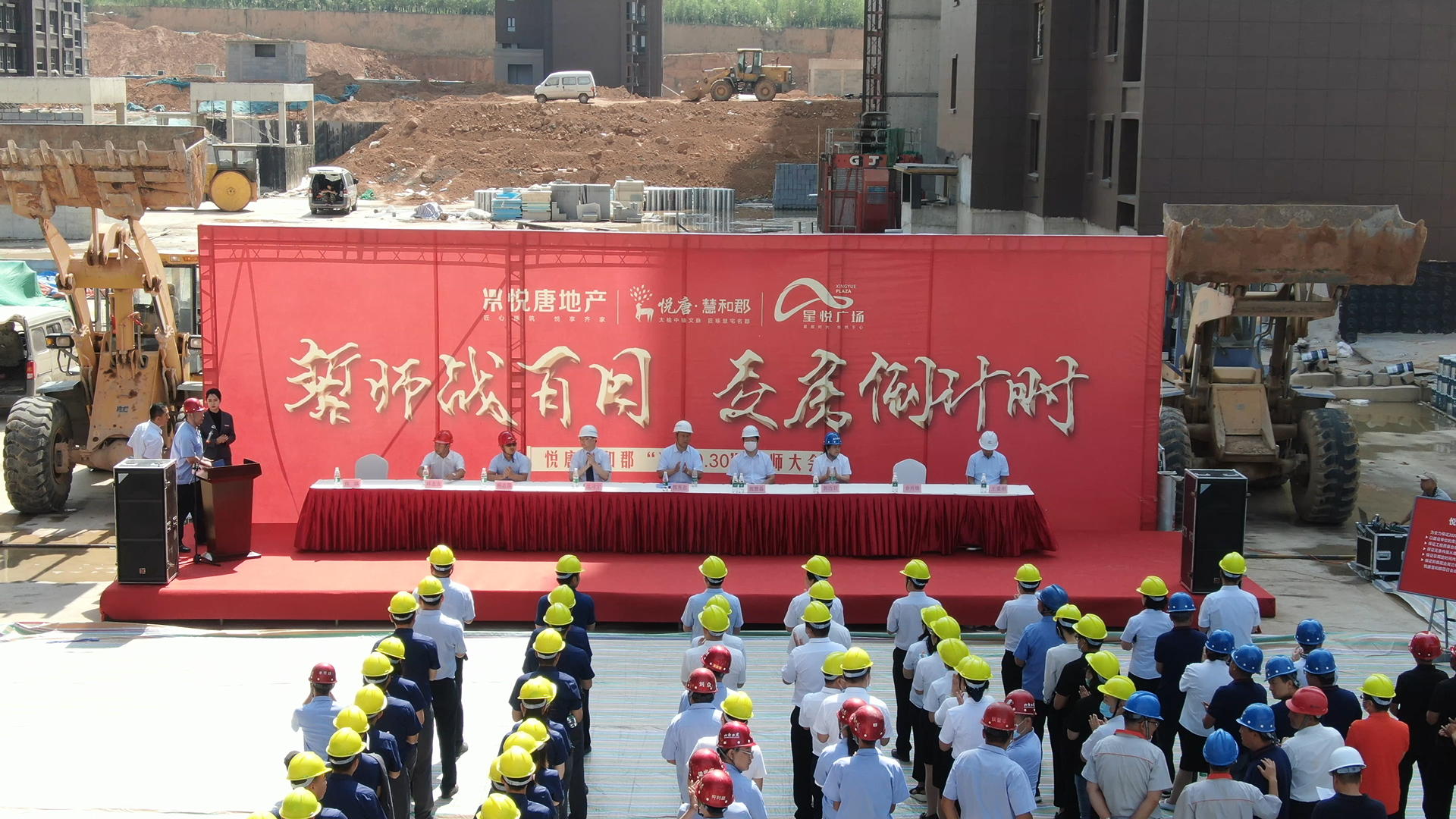 觀摩結(jié)束,全體人員行至主會(huì)場,只見主席臺(tái)上“誓師戰(zhàn)百日、交房倒計(jì)時(shí)”鎏金大字磅礴而現(xiàn),兩側(cè)裝載機(jī)猶如雄獅俯臥、旌旗招展颯颯威武!全體人員就位,工程百日會(huì)戰(zhàn)誓師大會(huì)正式拉開帷幕!